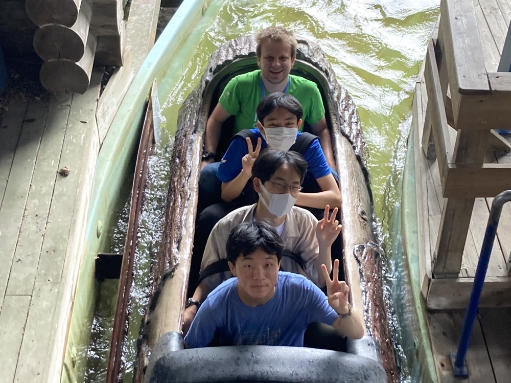 ウォータースライダーでピースサインの 北山・井本・北村の3選手と 日本チームガイドのオスカーさん |